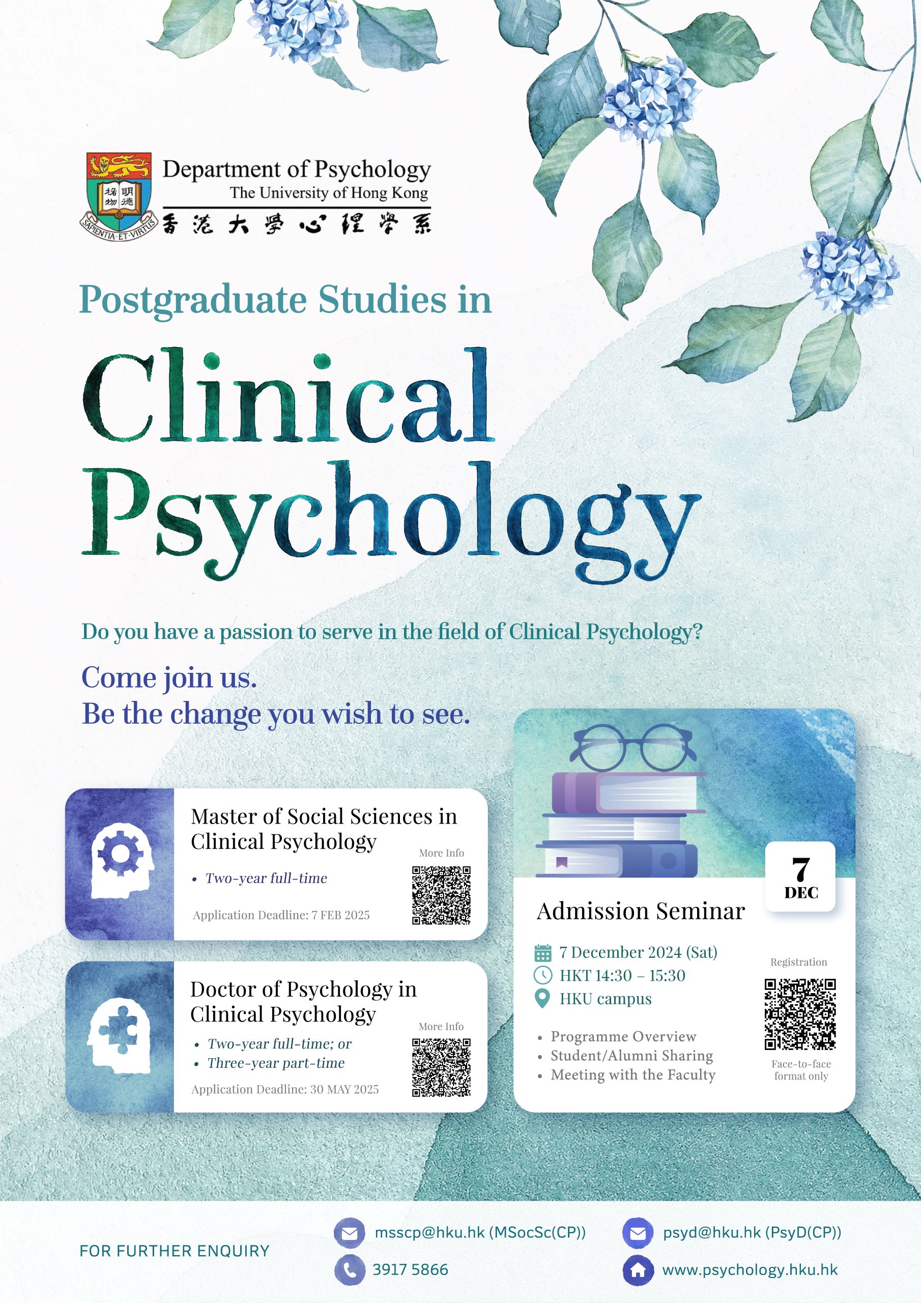 Please first read the FAQ of the TPg admission website for further details. For additional enquiries, please send an email to msscp@hku.hk and quote your full name in English and application number in the email. Applicants may contact the Department of Psychology at msscp@hku.hk if you do not receive your application results by 31 July 2025.